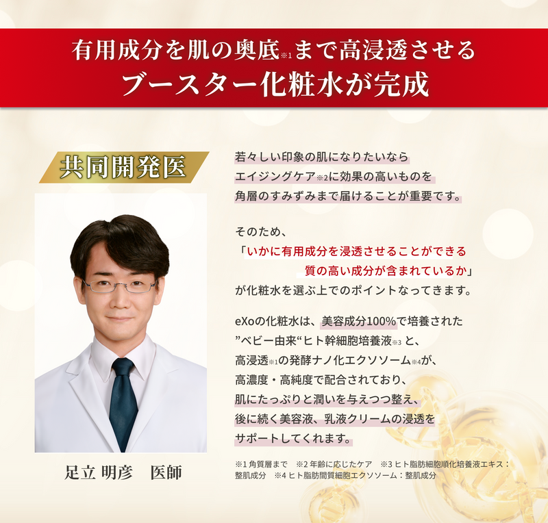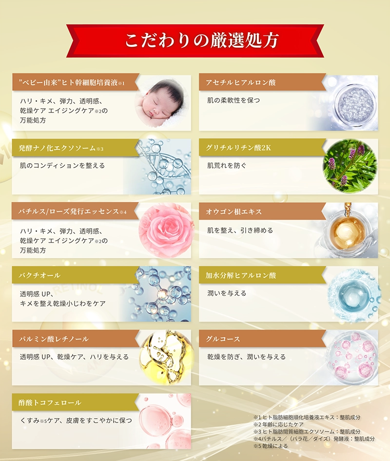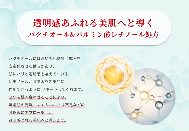 手のひらに500円玉大をとっていただき、ハンドプレスで優しく押し込んでお顔全体にむらなく浸透させて下さい。お肌の調子が気になるときは、さらに500円玉大をもう一度とっていただき、同じようにお顔全体に再度浸透させる2度づけや、ケアしたい部分に化粧水を含ませたコットンをのせて5分ほどおくパックケアをオススメします。